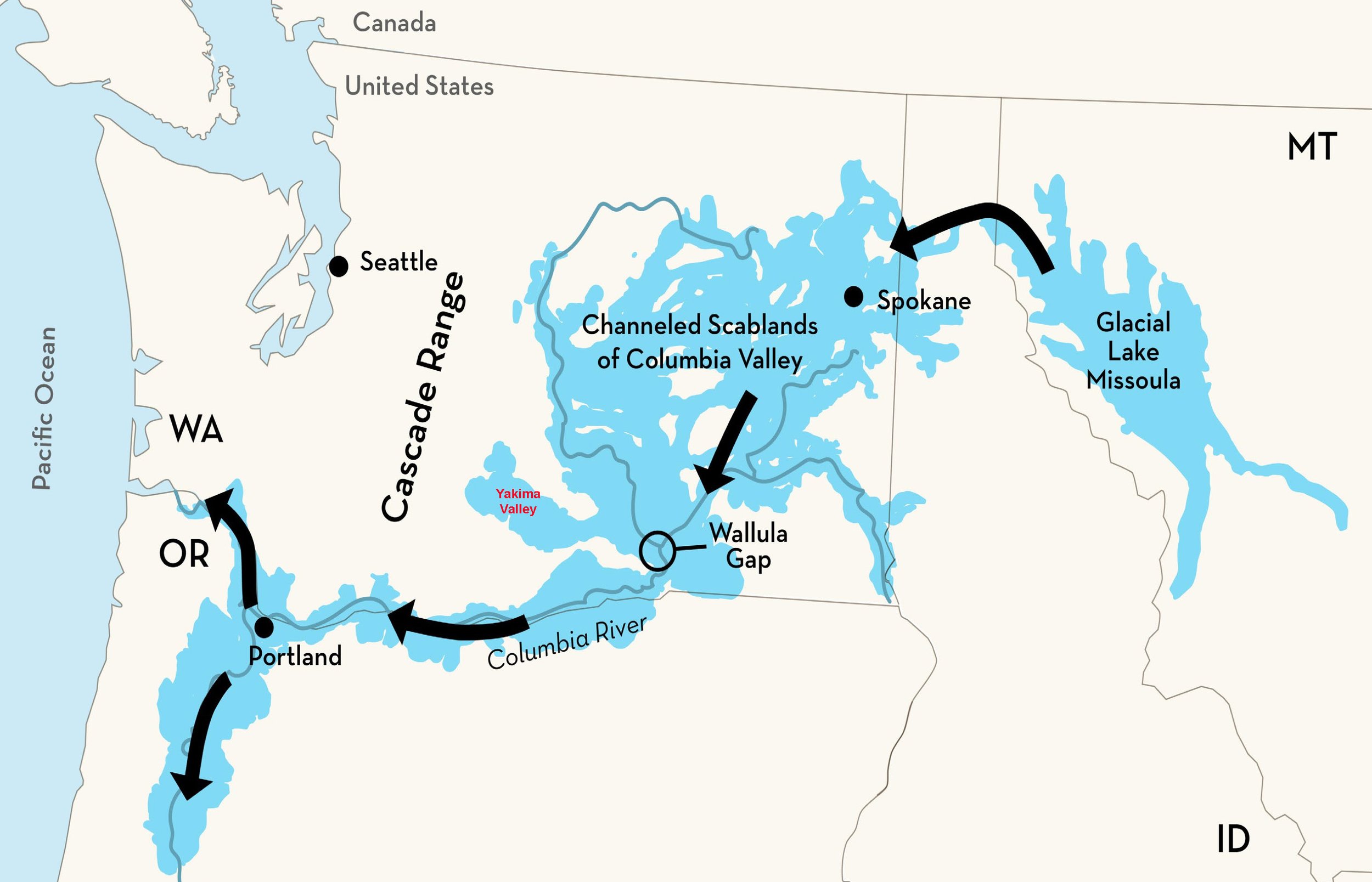 The soils in Yakima are the result of the enormous, biblical-scale floods that occurred as Glacial Lake Missoula breached its ice dams over and over some 15,000 to 13,000 years ago, draining the lake, scouring out the channelled scablands of the Columbia Plateau, and depositing river-channel deposits (fastwater, gravel and cobble soils) and slackwater silt and clay soils hundreds of feet deep in places. The Yakima Valley, running from the town of Yakima east-southeast towards Red Mountain, is a sort of “flood zone backwater” that was filled with deep clay-silt soils. Located just east of the Cascade Range, itself just east of the Olympic Range, the air is wrung clear of moisture by their double-squeegee effect, giving Yakima deep soils, and a sunny dry climate.