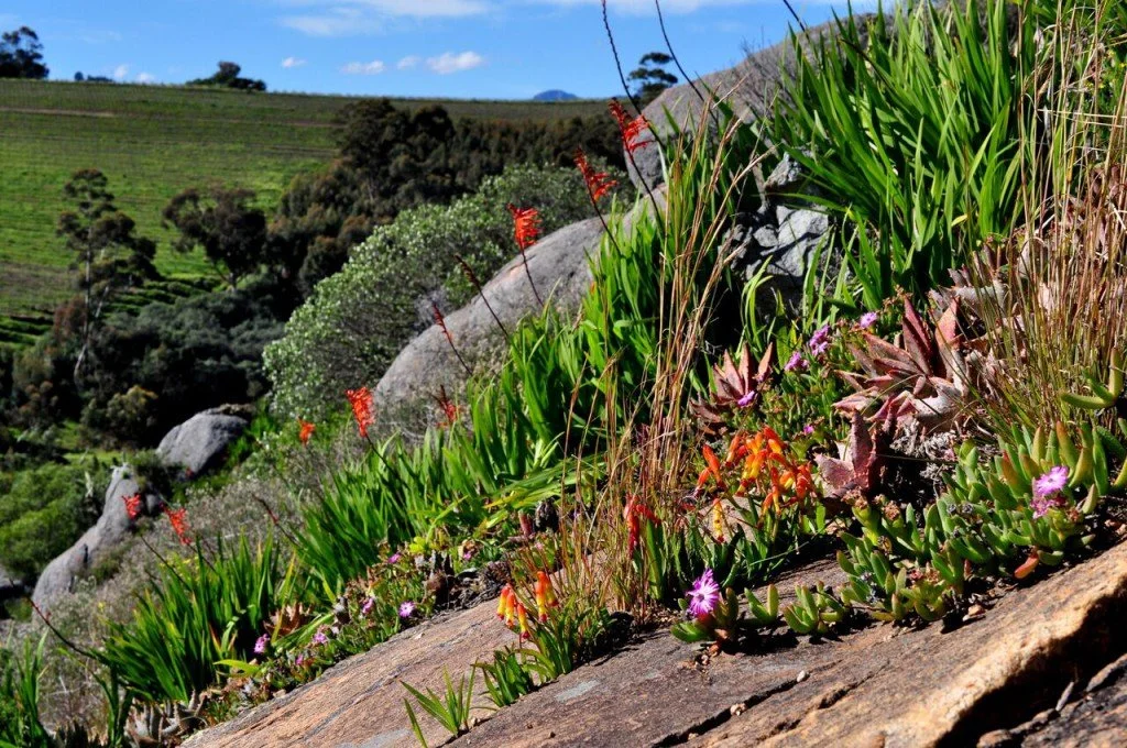 Situated in the Bottelary Hills of Stellenbosch, there is a difference of approximately 775 ft between the highest and the lowest areas on the estate. The highest point of the estate (1225 ft above sea level) provides a panoramic view over the Cape Peninsula, with False Bay to the left and Table Bay to the right.